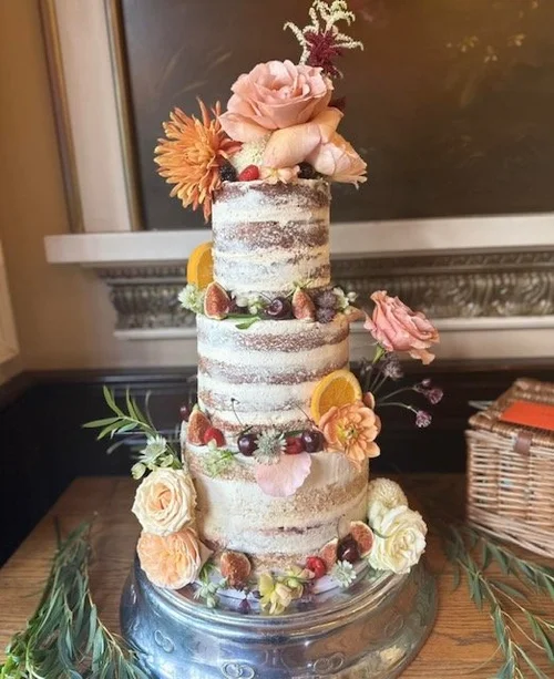 This wedding cake is an elegant and understated semi-naked design which features three tiers, each lightly coated with a thin layer of buttercream that allows the cake layers to peek through, enhancing its organic aesthetic.