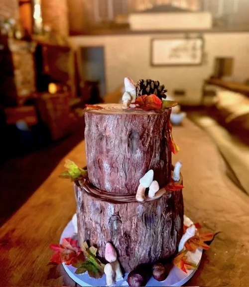 This woodland-inspired cake was created to celebrate Nathan and Jake’s special day — and blended in so perfectly with the stunning venue The Wool Tower! The rustic bark effect detailing and mushrooms are hand-crafted from modelling chocolate and bring that magical forest touch to life.