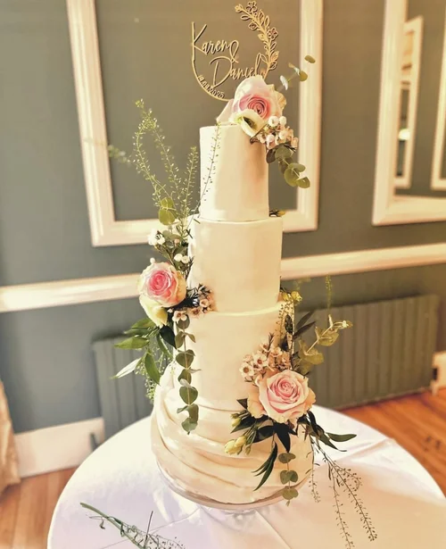 This beautiful four-tier fondant wedding cake stood as a romantic centrepiece at the stunning Magheramorne Estate. Smooth, clean fondant tiers are dressed with cascades of blush roses, eucalyptus, and soft greenery for a timeless, garden-inspired look. The gold personalised topper adds the perfect finishing touch.