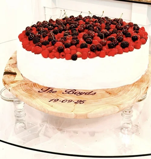 This wedding cake is a charming and rustic “semi-naked” design with a natural and elegant aesthetic. It features three tiers with a light buttercream coating, allowing the texture and colour of the cake layers to show through subtly. The cake is adorned with vibrant, fresh floral arrangements. Large, lush peonies in shades of pink take centre stage, complimented by smaller roses in deep magenta and peach. There are accents of lavender, delicate white daisies, and berries, creating a colourful, garden-inspired look. Eucalyptus and greenery sprigs add a soft, organic touch. The cake is topped with a custom laser-cut wooden topper that reads “Mr. & Mrs. Ward” surrounded by a wreath motif, adding a personal and modern rustic element. The cake is displayed on a wooden log slice, which enhances the natural, rustic vibe of the design and ties the theme together perfectly.